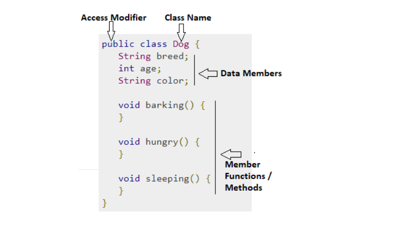 5. Body: The class body surrounded by braces, { }.