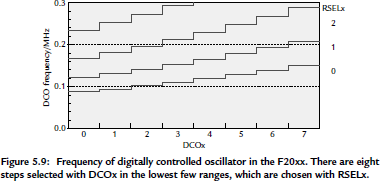 RSELx: Selects one of 16 coarse ranges of frequency. The frequencies in each range are larger than those in the one below by a factor of 1.3–1.4. The overall range is about 0.09–20 MHz. DCOM: Selects one of eight steps within each range. Each step increases the frequency by about 8%, giving a factor of 1.7 from the bottom to the top of the range. Thus the ranges overlap slightly. Figure 5.9 shows the frequency of the DCO in the low part of its range as a function of RSELx and DCOx. There is roughly a constant ratio between values so a logarithmic scale would be needed to show the full range clearly. TI does not provide much information about the innards of the DCO. It appears to be based on a type of RC oscillator whose frequency is programmed by a current, which is selected by RSEL. This feeds a ring counter whose period is adjusted with DCO. An external resistor Rosc can be connected to some devices to regulate the current instead of RSEL.