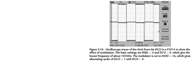 The lower trace shows repeated sweeps with persistence, as would be seen on an analog oscilloscope. The clock now appears to have jitter on the falling edges because of the two different periods, but the positive edges, which are used for triggering, all overlap. A truly periodic clock is found over the full period of 32 pulses (or fewer in special cases, such as that shown here). The values of RSEL, DCO, and MOD can be changed at any time to alter the frequency. Modulation can be turned off by setting MOD = 0 if a constant period is more important than an accurate, average frequency. The modulator serves little purpose if the DCO runs freely without calibration. There is nearly a factor of 2 between the minimum and maximum frequencies given in the data sheet for given values of RSEL and DCO, although this covers the full range of temperature and supply voltage. Therefore it is pointless to specify the frequency better than can be done with RSEL and DCO alone. A possible advantage of modulation is that there is less electromagnetic interference (EMI) from the clock because the energy is spread over a wider range of frequencies, but this is not a large effect with periods that are only 8% apart. A method to reduce EMI further is described in the application note Spread-Spectrum