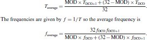 Finer control of the average frequency is obtained by modulating the frequency of the oscillator between the selected value of DCO and the next step up (DCO+1). This needs DCO < 7 of course. Each period of 32 clock cycles contains MOD cycles with the higher frequency given by (DCO+1) and (32−MOD) cycles with the lower frequency given by DCO. The average period over these 32 cycles is therefore