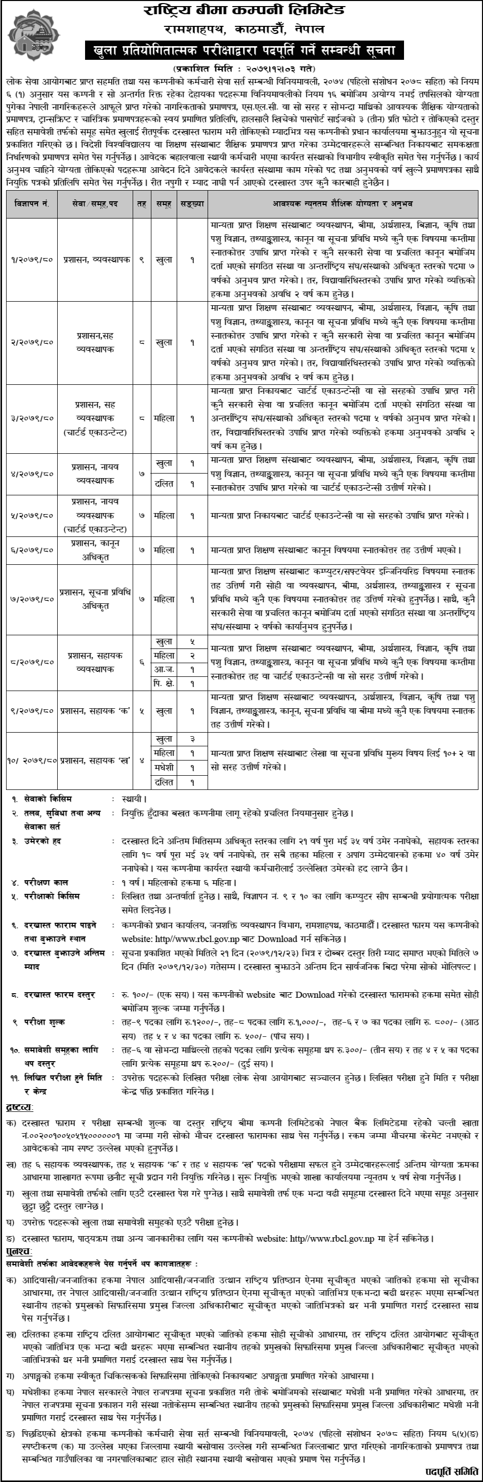 Rastriya Beema Company Limited, Ramshahpath, Kathmandu, Nepal Notification regarding filling up of posts through open competitive examination