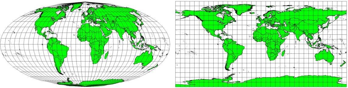 The world in different projections. A Mollweide Equal Area projection left, a Plate Carree Equidistant Cylindrical projection on the right.