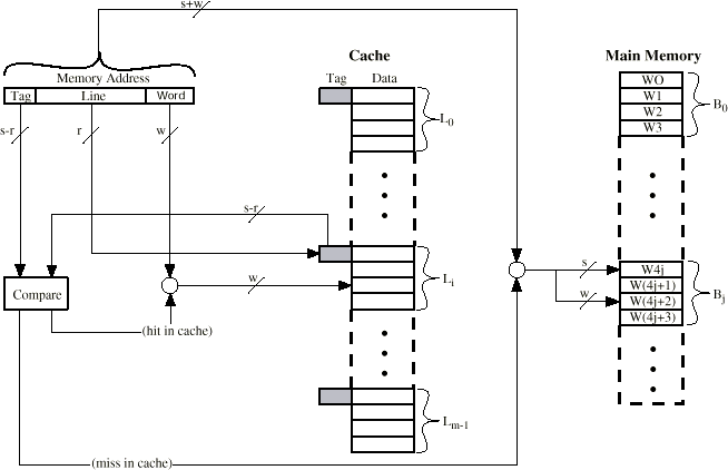- The cache logic interprets these s bits as a tag of (s-r) bits most significant position and a line field of r The latter field identifies one of the m = 2r lines of the cache.