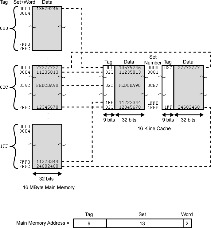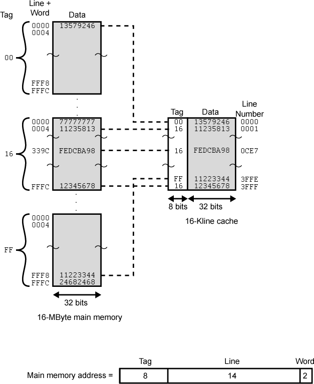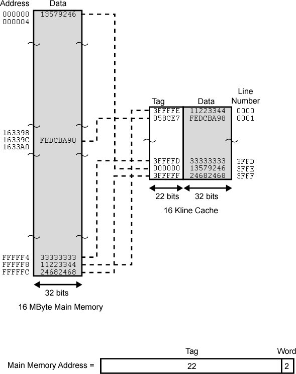 - The main memory consists of 16 Mbytes with each byte directly addressable by a 24 bit address (224 = 16Mbytes). Thus, for mapping purposes, we can consider main memory to consist of 4Mbytes blocks of 4 bytes each.
