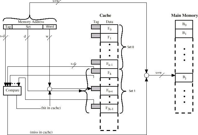 - Cache control logic interprets a memory address simply as three fields tag, set and word. The d set bits specify one of v = 2d Thus s bits of tag and set fields specify one of the 2s block of main memory.