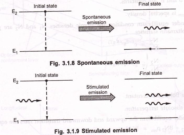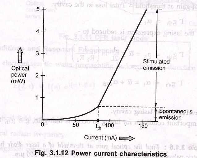 • The output of laser diode depends on the drive current passing through it. At low drive current, the laser operates as an inefficient Led, When drive current crosses threshold value, lasing action Fig. 3.1.13 illustrates graph comparing optical powers of LED operation (due to spontaneous emission) and laser operation (due to stimulated emission).