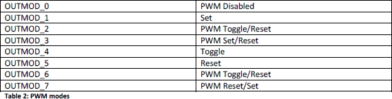 We use the |= operator so the bits we do not wish to change remain the same. Next, we must set the PWM mode through the CCTLx register, where x is the port number of the pin. For example, to use “P1.2/TA0.1/A2”, we would use CCTL1. The modes are pictured below in Table 2.
