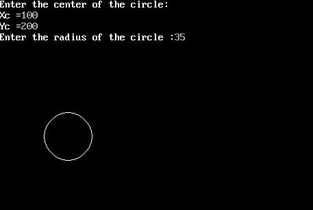 int gd=DETECT,gm; initgraph(&gd,&gm,"C:\\TurboC3\\BGI"); printf("Enter the center of the circle:\n"); printf("Xc =");