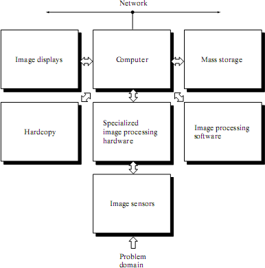 Although large-scale image processing systems still are being sold for massive imaging applications, such as processing of satellite images, the trend continues toward miniaturizing and blending of general-purpose small computers with specialized image processing hardware. Figure 3 shows the basic components comprising a typical general-purpose system used for digital image processing. The function of each component is discussed in the following paragraphs, starting with image sensing.