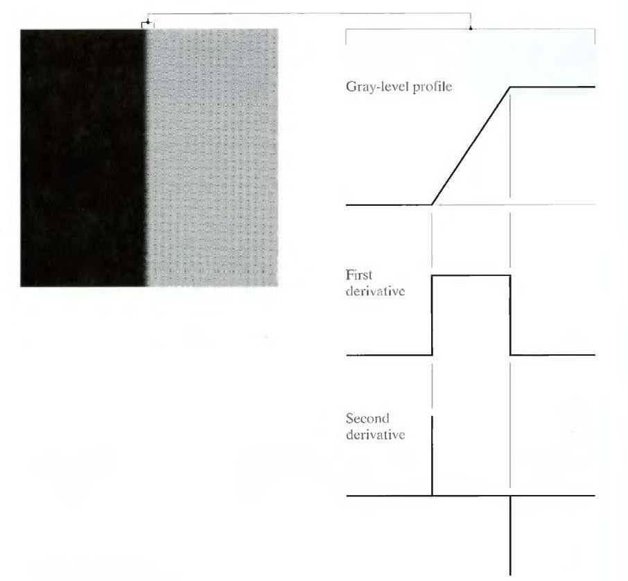 The slope of the ramp is inversely proportional to the degree of blurring in the edge. In this model, we no longer have a thin (one pixel thick) path. Instead, an edge point now is any point contained in the ramp, and an edge would then be a set of such points that are connected. The "thickness" of the edge is determined by the length of the ramp, as it transitions from an initial to a final gray level. This length is determined by the slope, which, in turn, is determined by the degree of blurring. This makes sense: Blurred edges lend to be thick and sharp edges tend to be thin. Figure 2.2(a) shows the image from which the close-up in Fig. 2.1(b) was extracted. Figure 2.2(b) shows a horizontal gray-level profile of the edge between the two regions. This figure also shows the first and second derivatives of the gray-level profile. The first derivative is positive at the points of transition into and out of the ramp as we move from left to right along the profile; it is constant for points in the ramp; and is zero in areas of constant gray level. The second derivative is positive at the transition associated with the dark side of the edge, negative at the transition associated with the light side of the edge, and zero along the ramp and in areas of constant gray level. The signs of the derivatives in Fig. 2.2(b) would be reversed for an edge that transitions from light to dark.