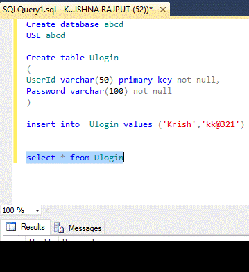 insert into Ulogin values ('Krish','kk@321') //insert value in Ulogin table