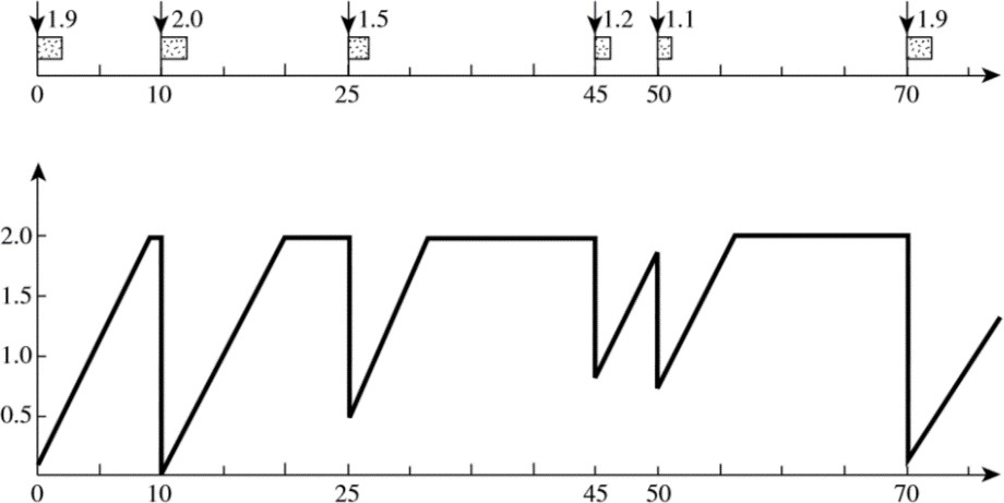 We first introduce the notion of a (Λ, E) leaky bucket filter, then define the leaky bucket model. This kind of fillter is specified by its input rate Λ and size E: The filter can hold at most E tokens at any time and it is filled with tokens at a constant input rate of Λ tokens per unit time. A token is lost if it arrives at the filter if the filter already contains E tokens. It can be assumed of sporadic task that meets the (Λ, E) leaky bucket constraint as if its jobs were generated by the filter in the following manner. The filter may release a job with execution time e when it has at least e tokens. After the release of this job, the e tokens are removed from the filter. A job cannot be released when the filter has no token. Therefore, not any job in a sporadic task that satisfies the (Λ, E) leaky bucket constraint, has execution time larger than E. The total execution time of all the jobs which are released within any time interval of length E/Λ is less than 2E. A periodic task with period equal to or larger than E/ Λ and execution time equal to or less than E satisfies the (Λ, E) leaky bucket constraint. A sporadic task S = (1, p, p’, I) that fits the FeVe model satisfi• es the constraint if p’ = 1/ Λ and E = (1− p/p’)I/p’.