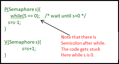 while (s==0); /* wait until s>0 */ s=s-1;